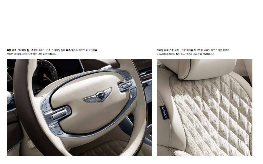프라임 나파가죽 시트의 경우 가공 처리를 최소화한 고유의 자연스러운 감촉과 G-MATRIX 패턴의 퀼팅 디자인으로 고급감을 더해주고 있습니다.
